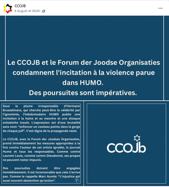 The CCOJB (Coordination Committee of Jewish Organizations in Belgium) and the Forum der Joods Organisaties have also joined the legal push, issuing a press release accusing Brusselmans of seeking infamy through hateful and dangerous rhetoric. They assert that his violent rhetoric towards Jews constitutes not just a violation of journalistic ethics but a clear incitement to harm .